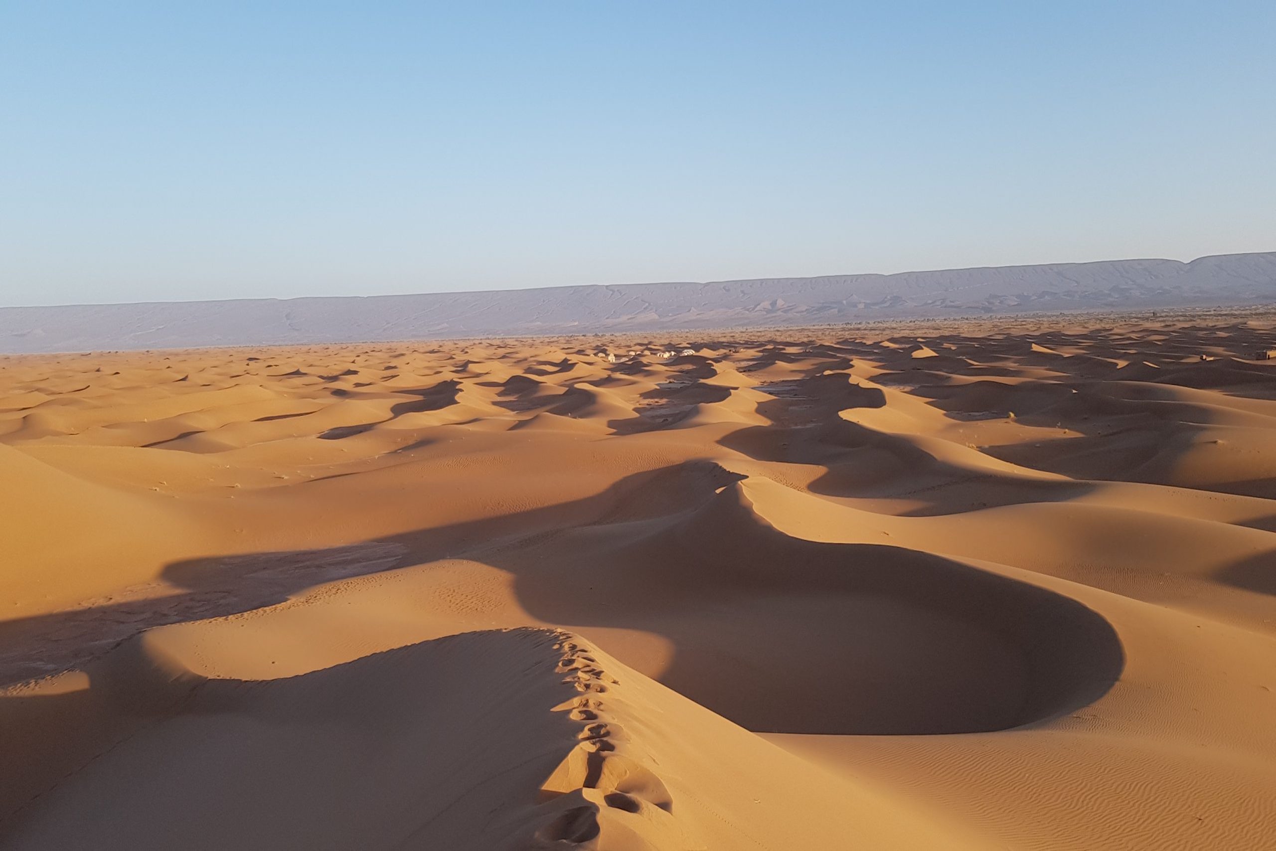 Am Nachmittag kommen wir in M’hamid an, wo wir in zwei Geländewagen umsteigen und nach ca. 2 Stunden Fahrt durch die Wüste, unser komfortables Camp in den Dünen des Erg Chegaga erreichen. Auf der Route ins Camp liegt die „Source sacrée“, eine heilige Oase, hier planen wir einen Zwischenstopp.